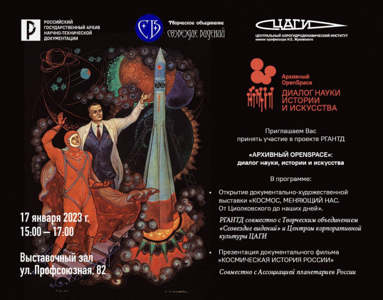 В программу проекта «АРХИВНЫЙ OPENSPACE» входит открытие документально-художественной выставки «КОСМОС, МЕНЯЮЩИЙ НАС. От Циолковского до наших дней». Экспозиция организована совместно с творческим объединением «Созвездие видений» и центром корпоративной культуры. На ней представлены произведения известных мастеров искусств – членов ТО «Созвездие видений», выполненные в различных техниках и стилях.