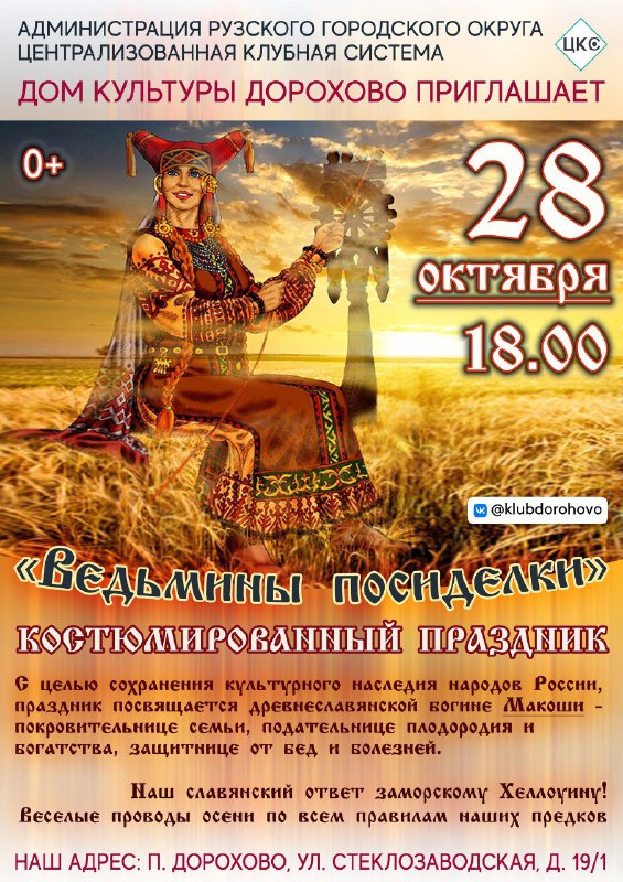 28 октября в Дороховском доме культуры Рузского городского округа состоится фольклорный костюмированный праздник «Ведьмины посиделки».