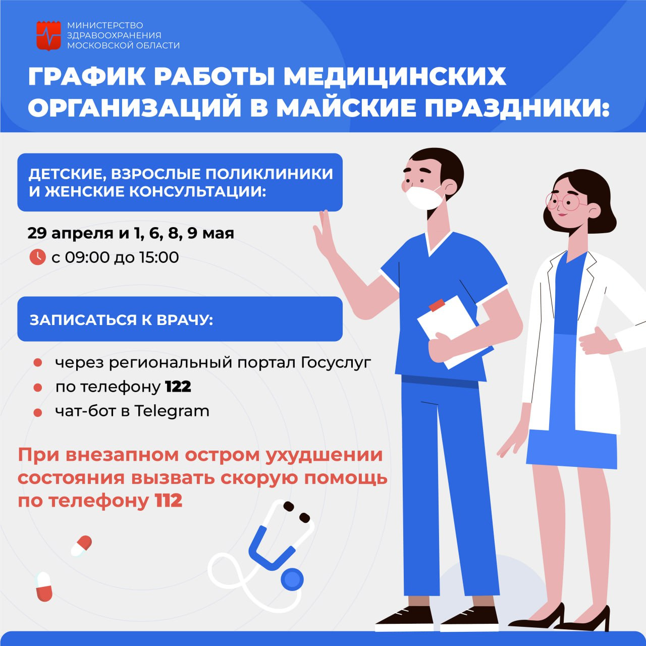 График работы поликлиник Подмосковья меняется на период майских праздников. Подробное расписание смотрите в инфографике.