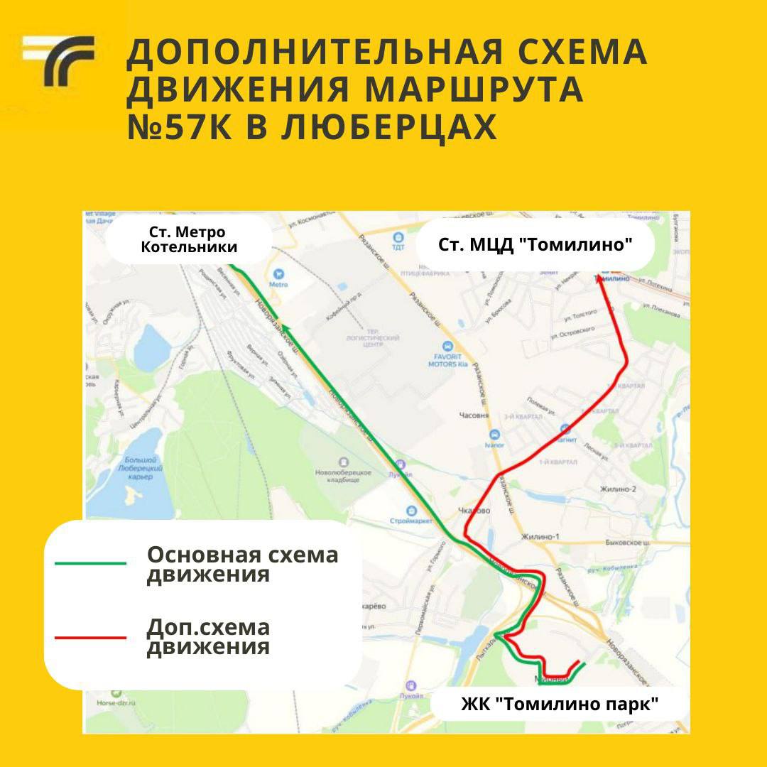 В городском округе Люберцы с 19 октября в рамках действующего маршрута № 57к (платф. Овражки - ст. «Томилино» - м. «Котельники» - ЖК «Томилино Парк» - ст. «Люберцы» будет организована дополнительная схема движения.