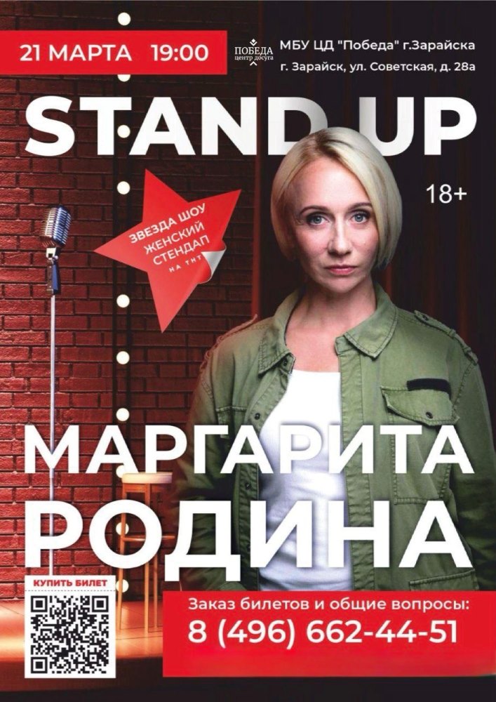 Стендап-концерт Маргариты Родиной в Зарайске 21 марта Успей стать участником невероятно уютного и позитивного вечера.