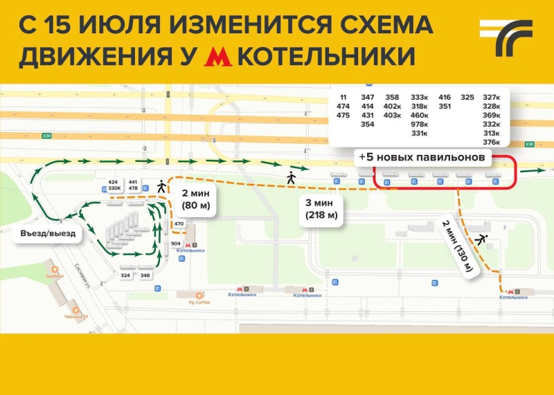 Обратите внимание, что пока автобусы отходят от остановки на отстойно-разворотной площадке у м. Котельники (выход №5).
